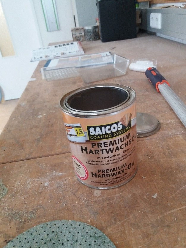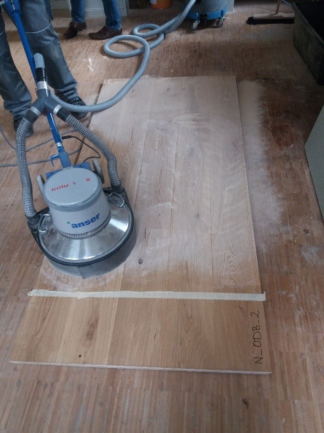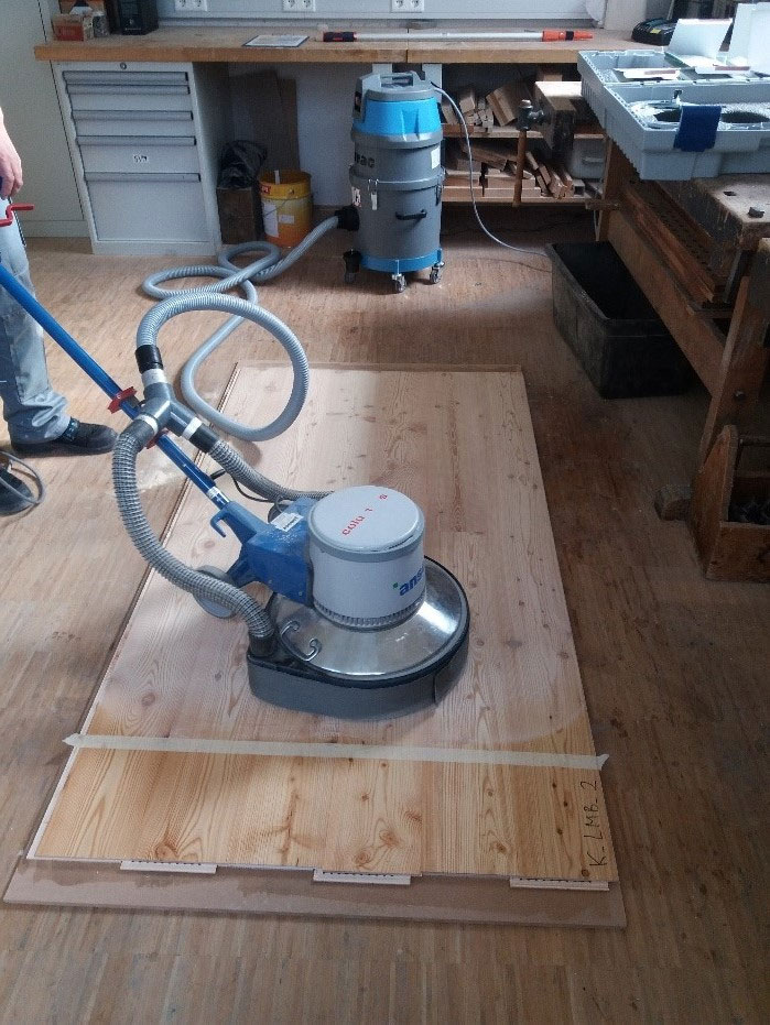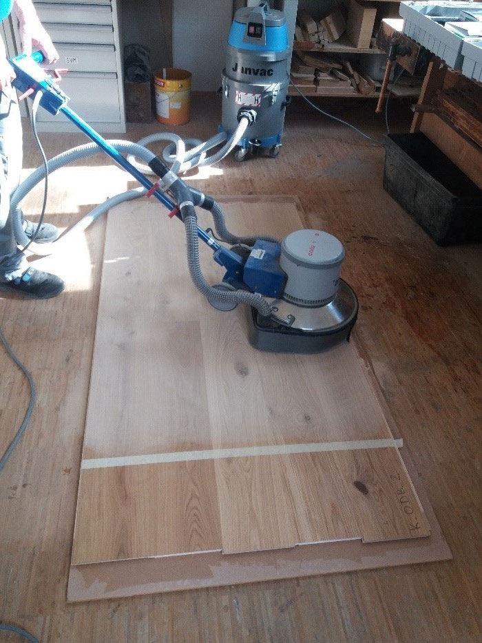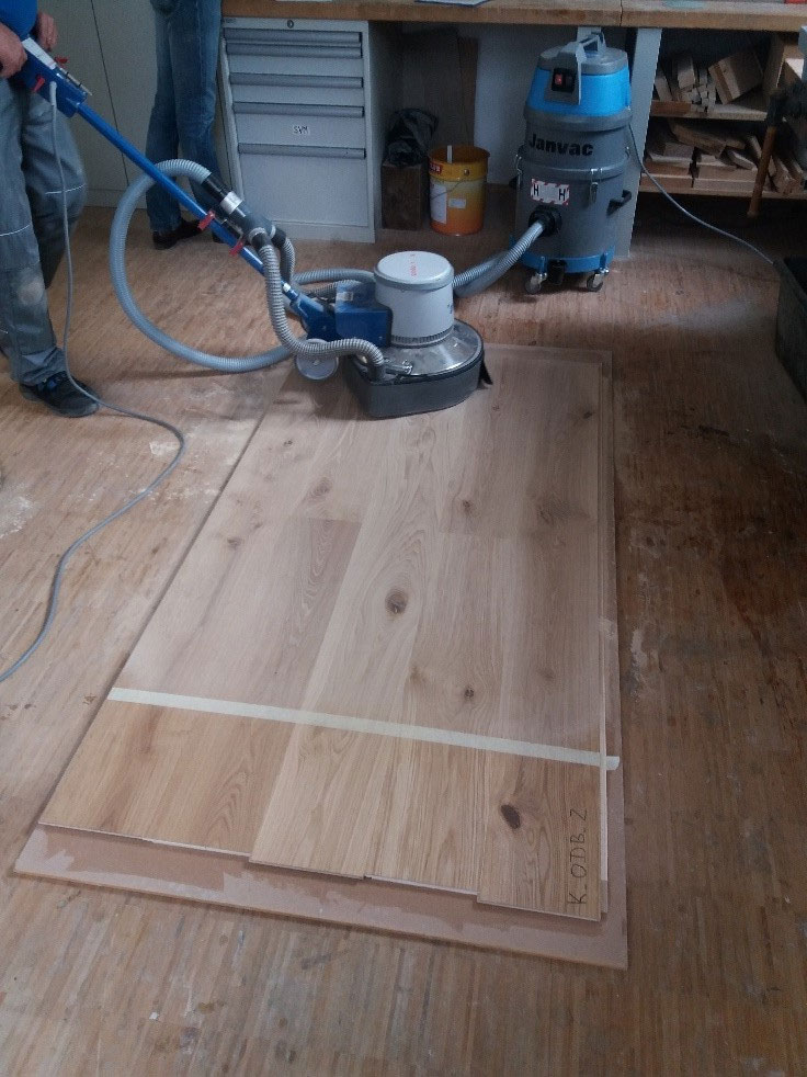 Bei den lackierten Bodenmustern erfolgte das mehrstufige Schleifen mit der Columbus Einscheibenmaschine. Die geölten Holzflächen wurden nicht oder nur in geringem Ausmaß geschliffen.