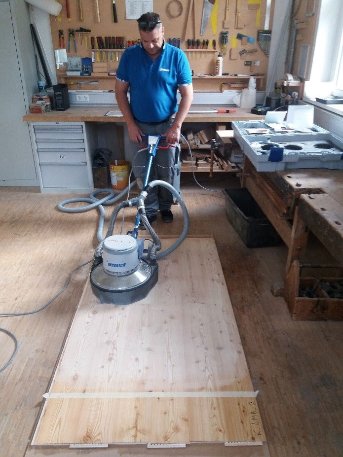 Mit Unterstützung der Firma Janser untersuchte die Holzforschung Austria im Rahmen des EU-Projekts „SURF-PARQUET“ die Möglichkeiten der Reinigung und Renovierung von strukturierten Parkettböden.
